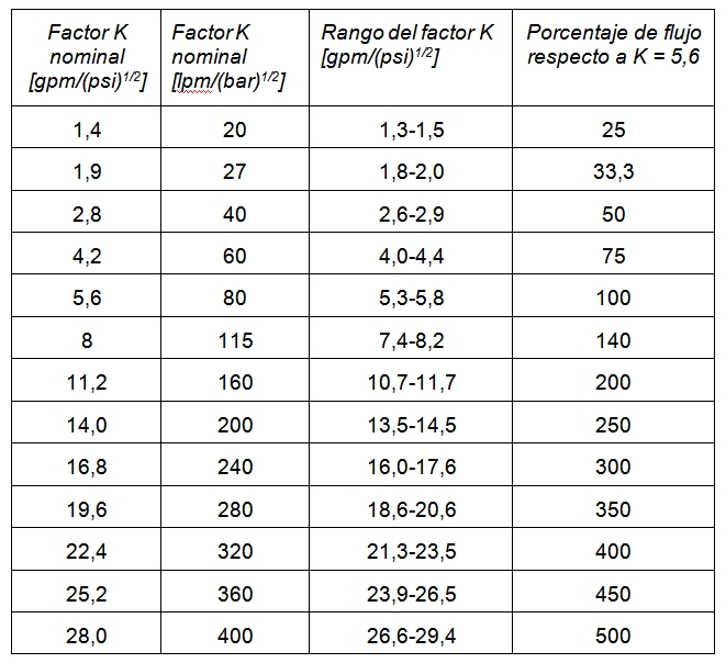 También es de destacar que existe una relación entre los rociadores con factores nominales K diferentes a 5,6 y éste; de tal manera que el caudal descargado por ellos a una presión dada es un porcentaje establecido (columna 4).